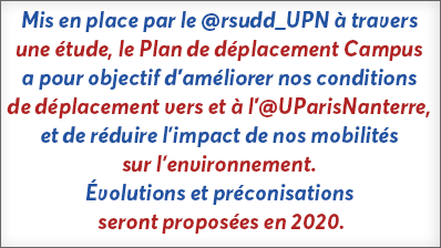 l’Université Paris Nanterre a élabore actuellement son Plan de Déplacement Campus, en cohérence avec le Plan de déplacement Urbain de la ville de Nanterre, ainsi que les plans de mobilités de la Région Ile-de-France et de Paris La Défense.