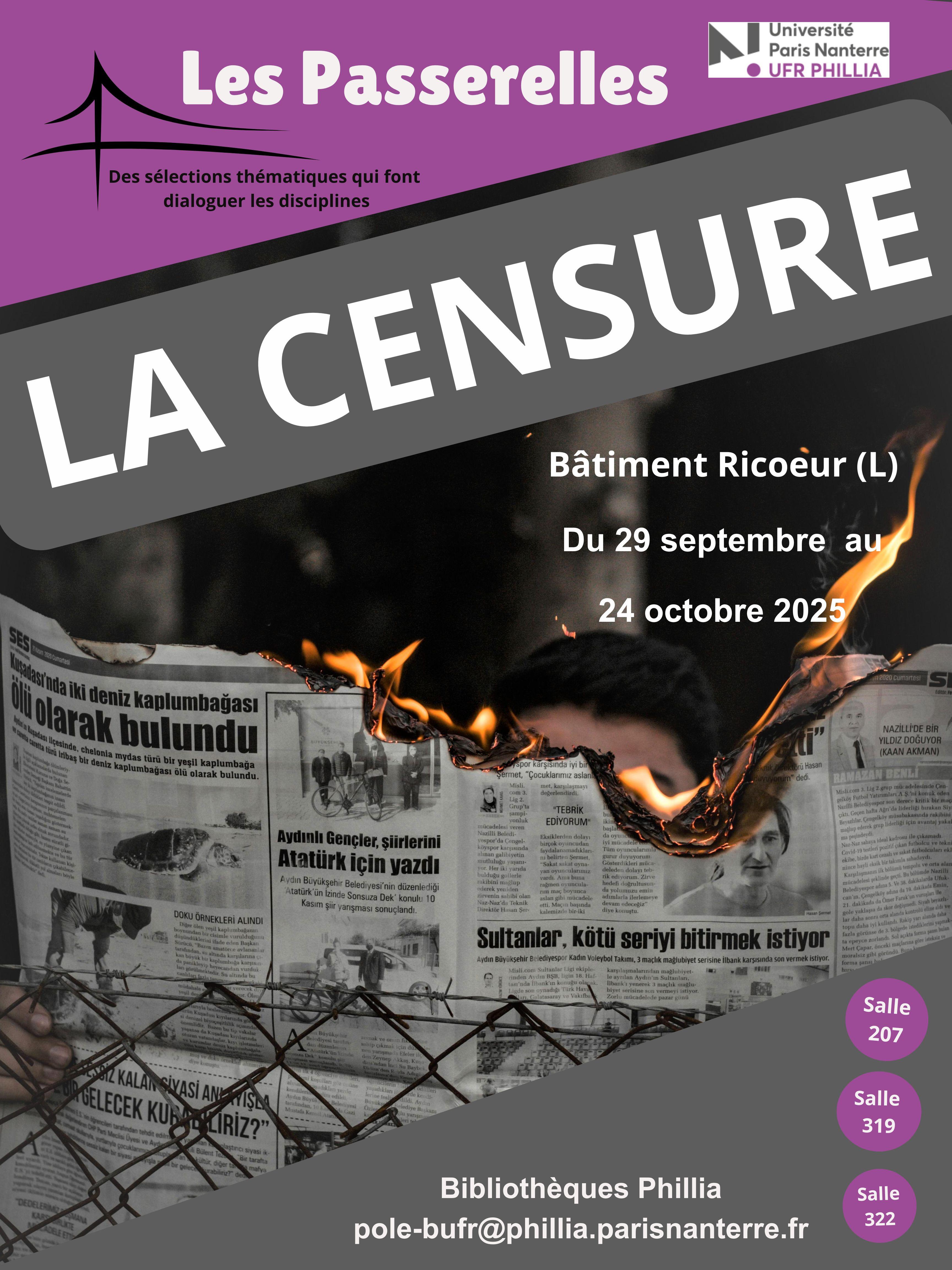 - [Les Passerelles - Censure] Rencontre avec Sébastien Mort22 octobre 2025Les bibliothèques de l'UFR PHILLIA valorisent des documents autour de la censure et organisent dans ce même cadre une rencontre « La censure aux USA sous le gouvernement Trump »avec Sébastien Mort, Maître de conférences en politique et médias US à l’université Paris Nanterre. Lire la suite