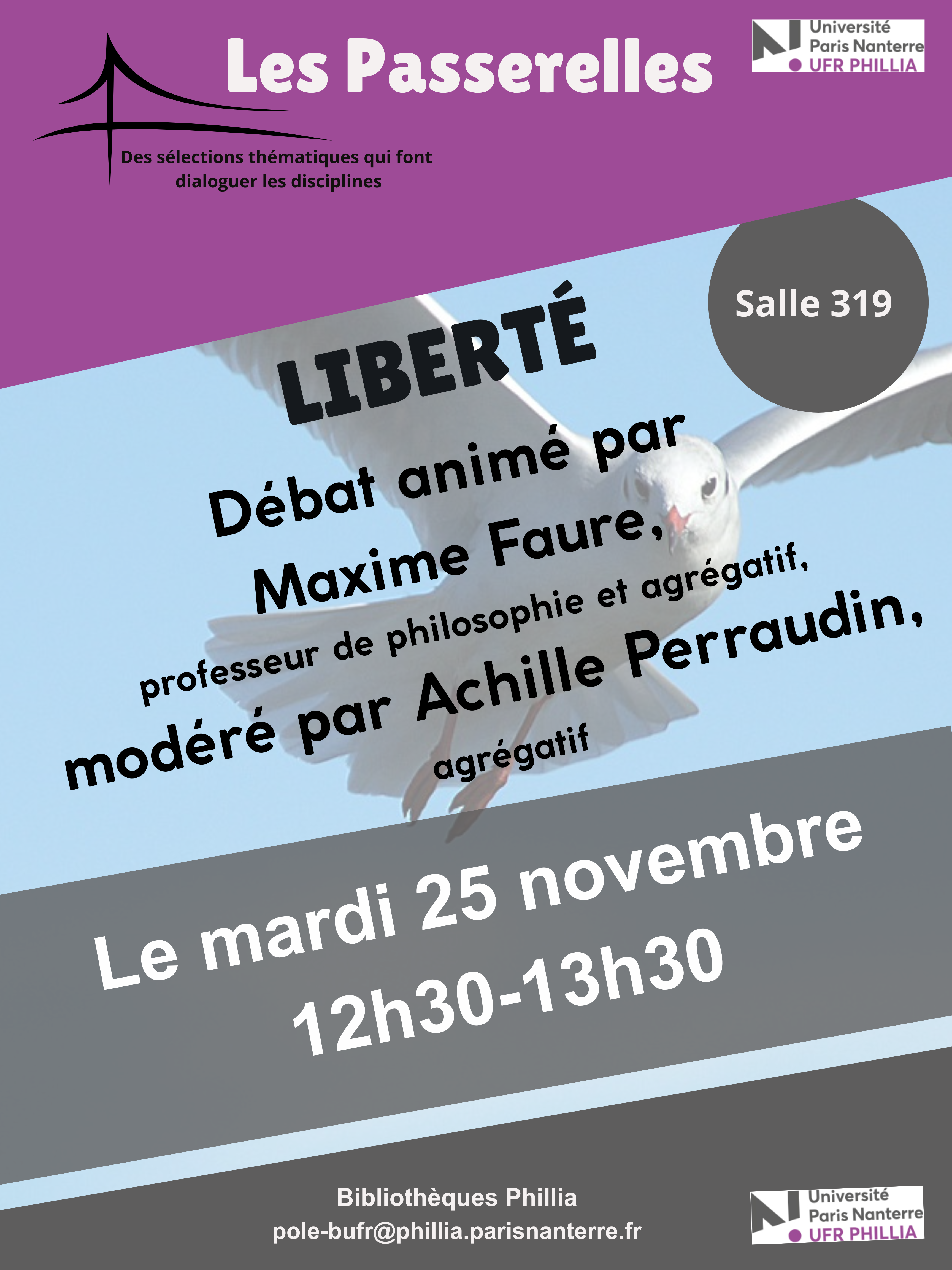 - [Les Passerelles - Liberté] Débat animé par Maxime Faure25 novembre 2025Les bibliothèques de l'UFR PHILLIA organisent Les Passerelles du mois de novembre autour de la notion de liberté en philosophie. Un débat est proposé sur ce thème, animé par Maxime Faure, professeur de philosophie et agrégatif. Modéré par Achille Perraudin, agrégatif. Lire la suite